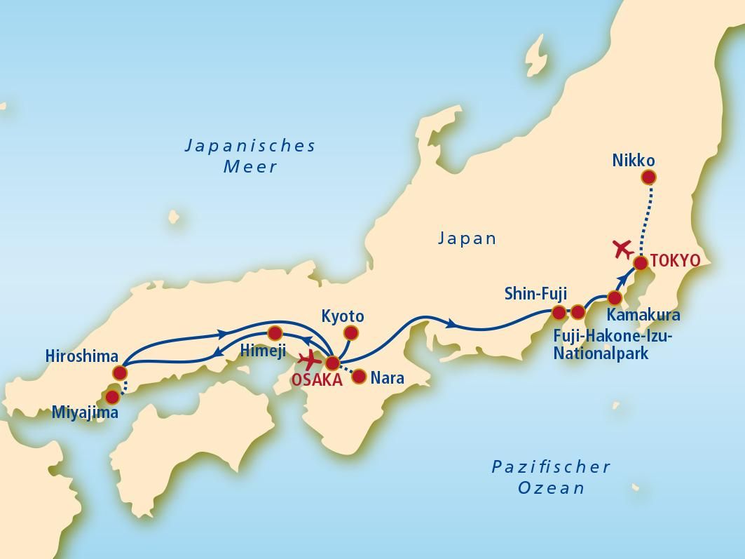 - Alle Bahnfahrten mit Japan-Railpass auf reservierten Plätzen in der 2. Klasse laut Programm
