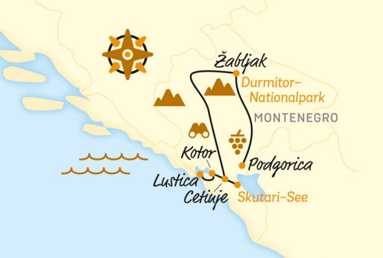 Die bizarren Berge des Durmitor-Massivs, die stille Schönheit des SkutariSees und die Bilderbuchlandschaften der montenegrinischen Adria-Küste können Sie gut zu Fuß erkunden – wenn Sie gut zu Fuß sind und ein paar Monate lang keine anderen Prioritäten haben. Ebenso beeindruckend, aber wesentlich komfortabler und bedeutend weniger zeitintensiv ist die Erkundung per E-Bike. Unsere sorgfältig komponierte E-BikeErlebnisreise bietet Ihnen diese Vorteile – und lässt auch Genuss und Entspannung nicht zu kurz kommen. Genießen Sie die Gastfreundschaft der Einheimischen, die Ihnen stolz ihre lokalen Spezialitäten und regionalen Weine kredenzen. Und falls Ihnen einmal nicht nach Radfahren ist, können Sie jederzeit in den bequemen Begleitbus umsteigen.