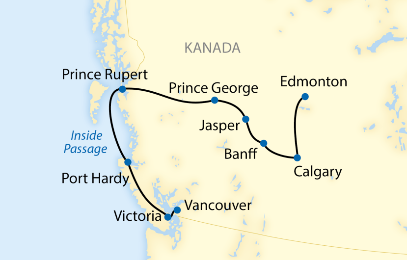 Großartiger geht es kaum! Die kanadische Provinz Alberta erwartet Sie mit imposanten Bergen, weiten Prärien und endlosen Wäldern. Hier treffen Sie auf die Métis-Kultur und erleben besondere Tage bei wundervoll warmherzigen Gastgebern. Mit dem Skeena fahren Sie abseits der Hauptrouten durch faszinierende Bergwelten. Hier machen Berge den Weg frei für malerische Täler und das pulsierende Stadtleben verschmilzt mit der Natur, die alles umgibt. Sie fahren mit der Fähre entlang einer der schönsten Fjordküsten der Welt durch die Inside Passage. Auf Vancouver Island entdecken Sie die traditionell britisch geprägte Hauptstadt Victoria. Sie beenden Ihre Reise in Vancouver – Kanadas trendiger Westküsten-Metropole.