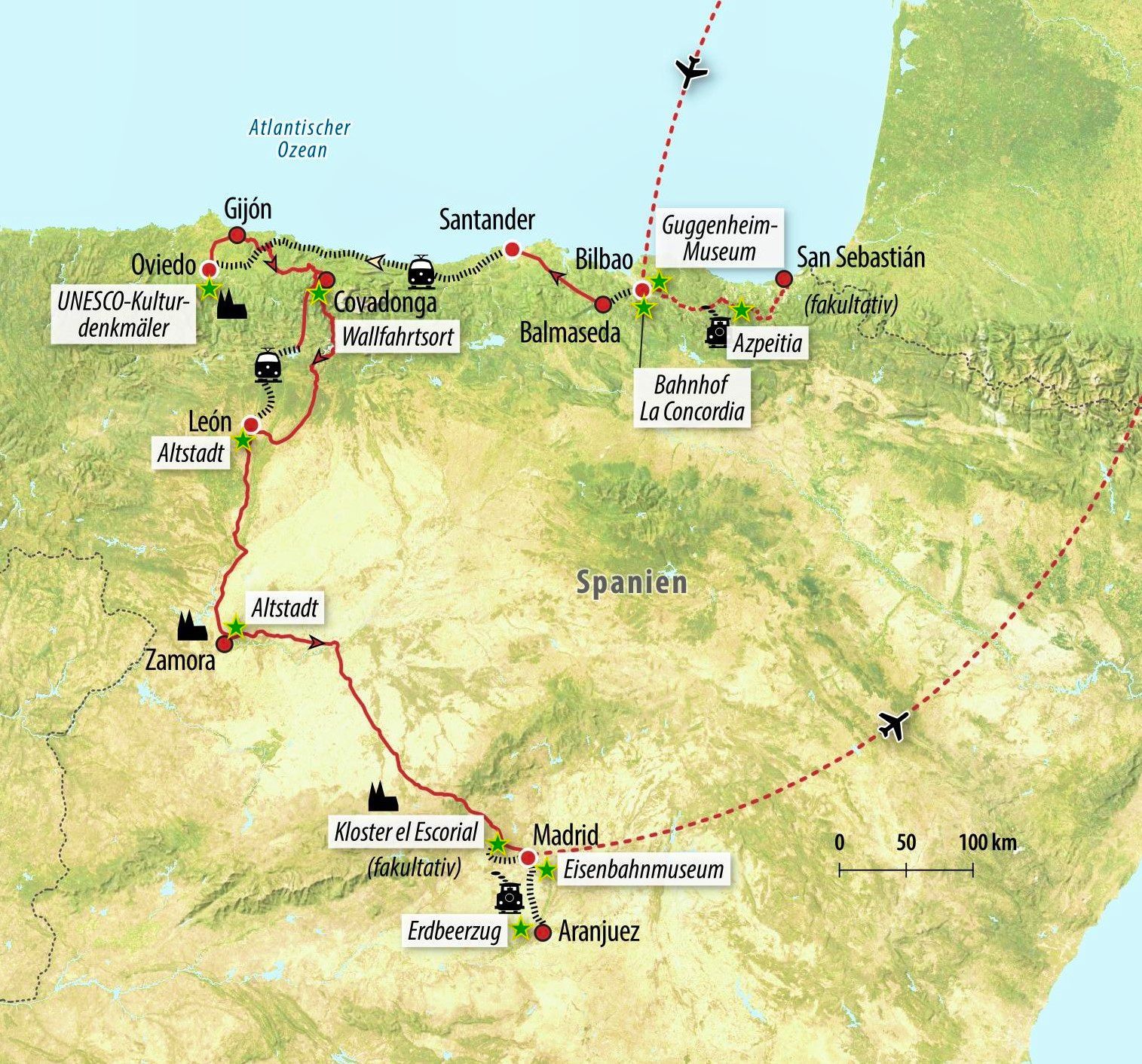 - Direktflüge ab/an Berlin nach Bilbao und von Madrid (weitere Flughäfen wie Dresden, Leipzig/Halle, Berlin, Düsseldorf, Frankfurt/Main, Hamburg, München oder Stuttgart buchbar, evt. Zwischenlandung möglich - ggf. gegen Aufpreis) | Reisepreis abhängig vom ausgewählten Abflughafen, Flughafenauswahl unter Termine & Preise