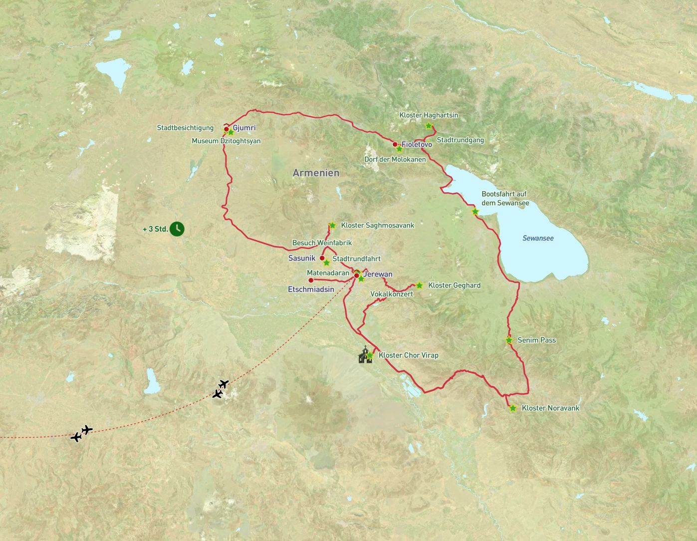 - Flüge mit Lufthansa/Austrian Airlines ab/an Deutschland über Frankfurt/Wien nach/von Jerewan (weitere Flughäfen buchbar, ggf. gegen Aufpreis)