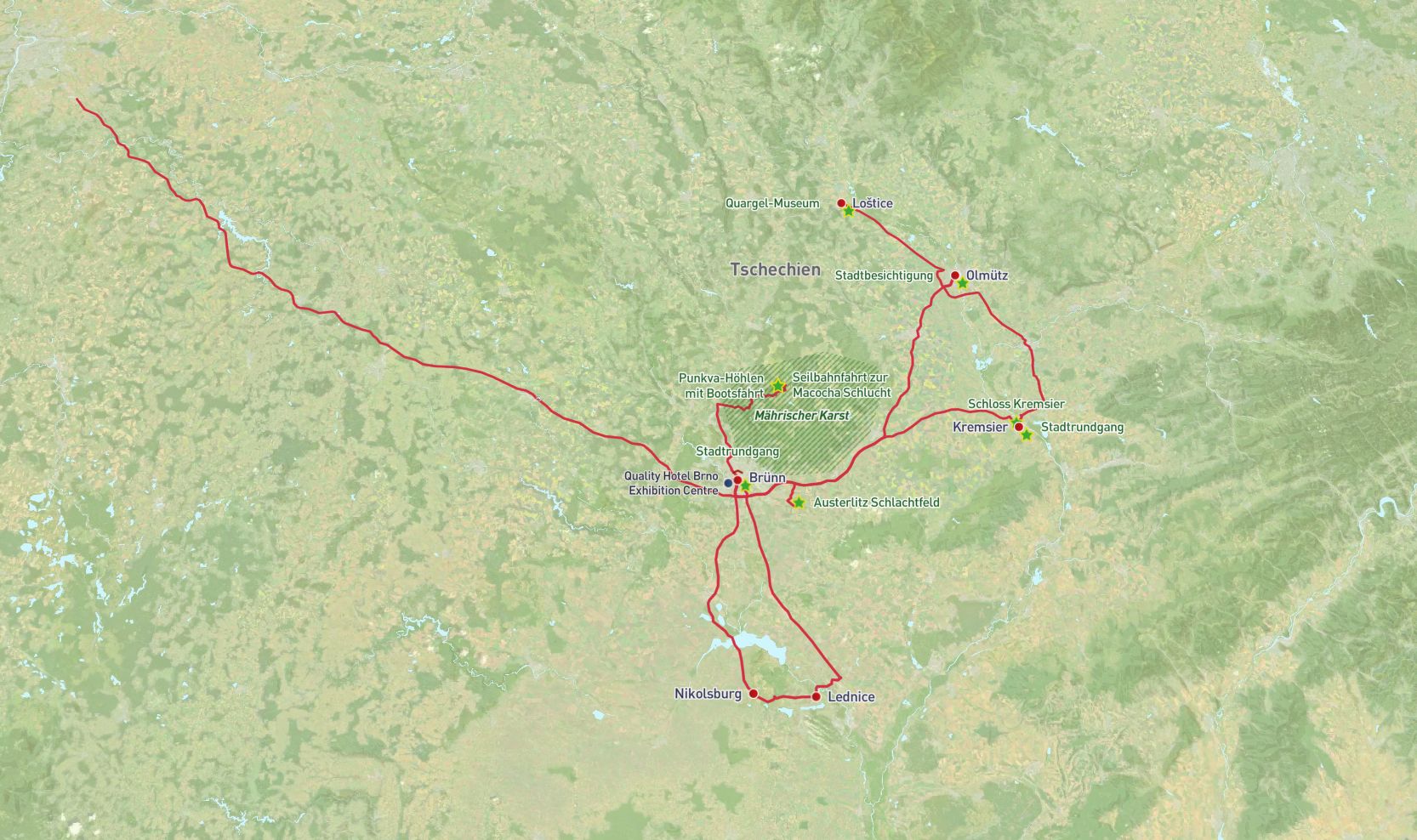 Mähren ist eine Region geprägt durch lange Geschichte, wunderschöne Natur und facettenreiche Kultur. Während Ihres 5-tägigen Rundreise lernen Sie UNESCO-Weltkulturerbestätten wie das Lednice-Valtice-Areal kennen, entdecken die Städte Brünn, Kremsier und Olmütz und lassen sich von der romantischen Natur der Region im Mährischen Karst verzaubern. Sie verkosten mährischen Wein und genießen die deftige tschechische Küche. Ihr Hotel befindet sich mitten im Zentrum der aufstrebenden südmährischen Hauptstadt Brünn, die Sie bei einem Rundgang und auch individuell erkunden können.
