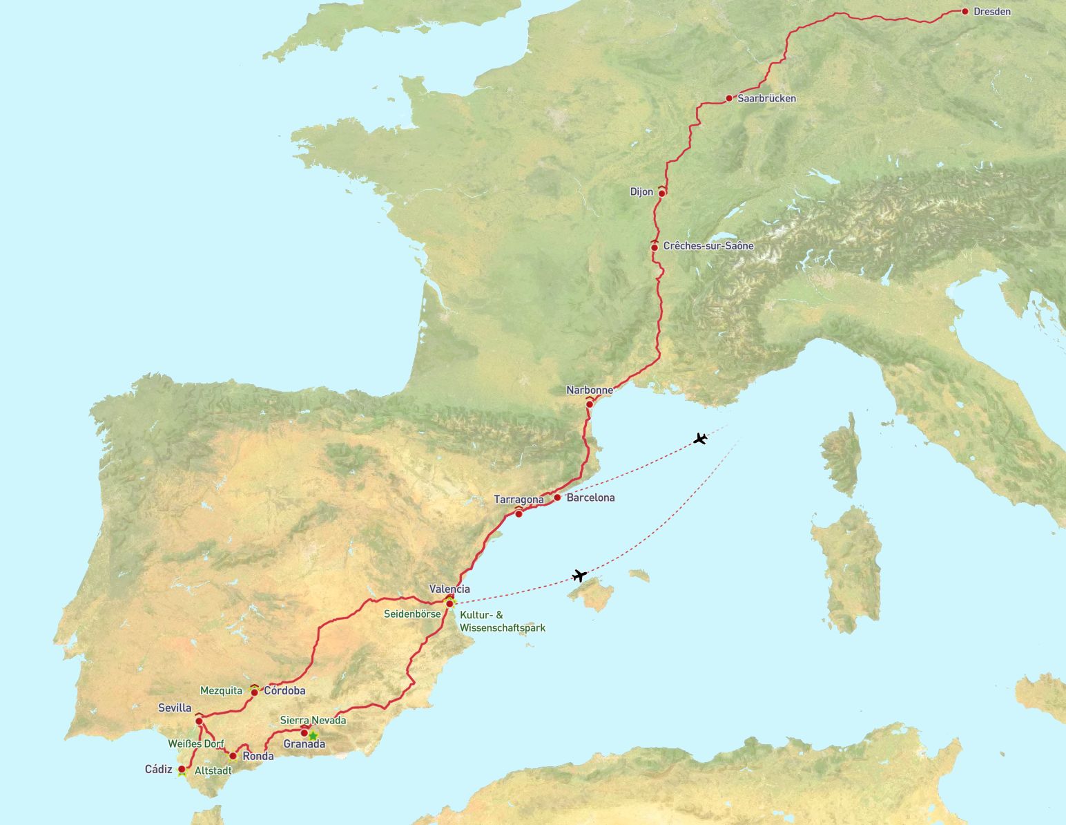 18.10.2025: Ihre Rundreise nach Süd-Spanien beginnt mit einer Reise auf deutschen und französischen Autobahnen zunächst in unser Nachbarland Frankreich bis in den Süden Burgunds. Ihr komfortabler Reisebus bringt Sie von Dresden über Frankfurt und Saarbrücken bis fast in den Raum Lyon. Hier werden Sie zum Abendessen erwartet und Sie übernachten im 4-Sterne Hotel.