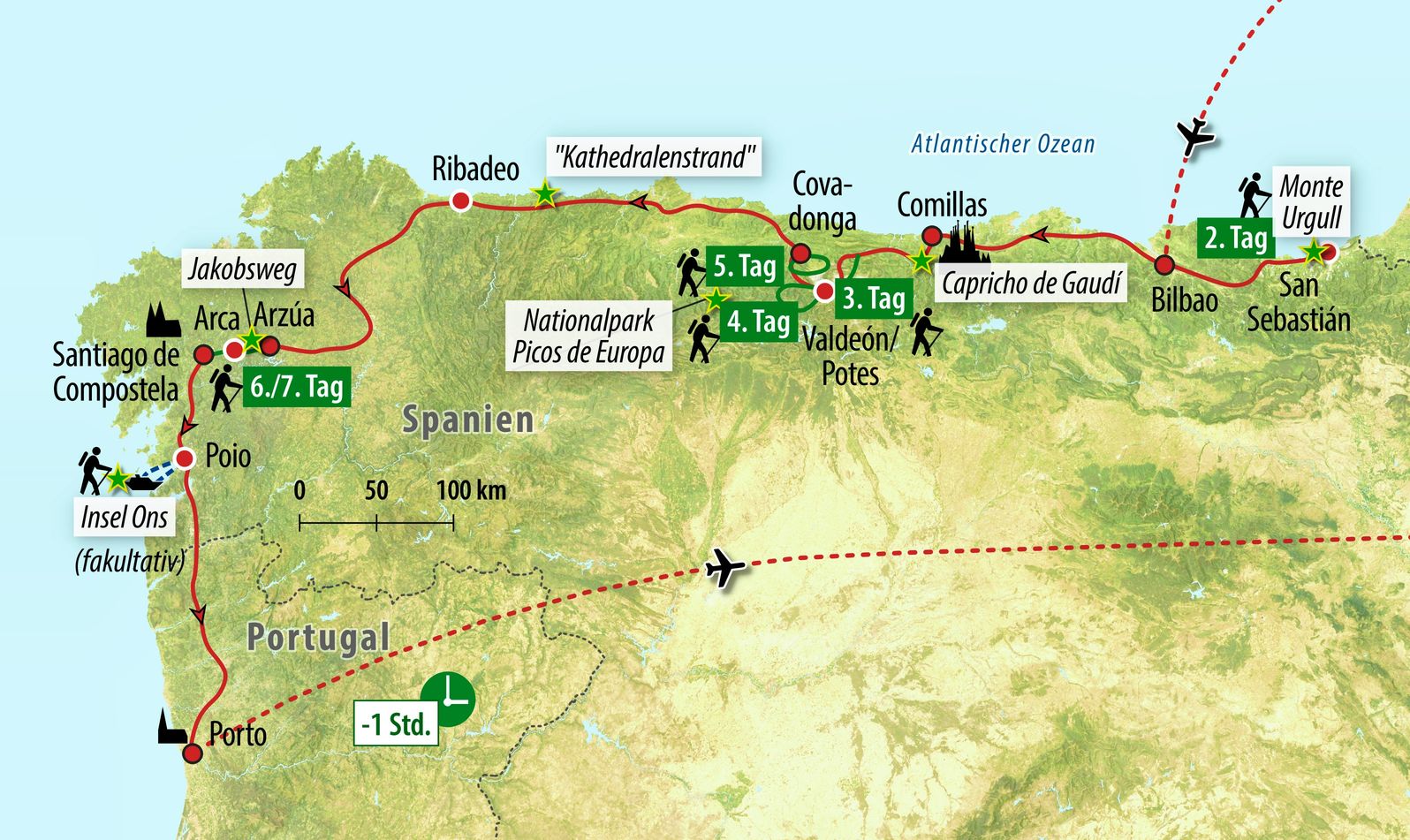 10 Tage Wanderreise in Nordspanien mit Bilbao – San Sebastian – Picos de Europa – Jakobsweg – Santiago de Compostela – Atlantikküste – Porto (58 Wanderkilometer)